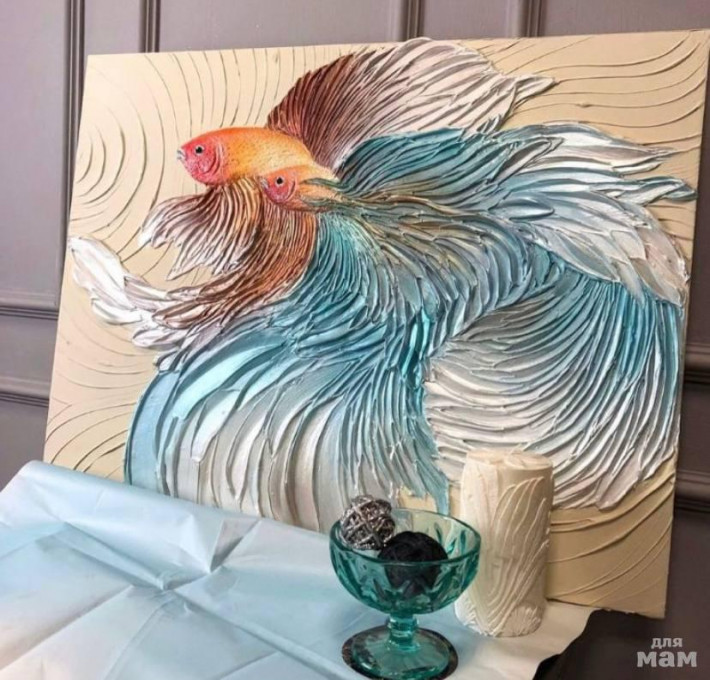 Дочка захотела нарисовать вот такую рыбку. Показали педагогу (мы сейчас занимается с новым педагогом Любовью). За три урока дочь сделала эту картину. Работа очень сложная. Работа с текстурной акриловой пастой. Сложно было выводить полосочки специальными различными инструментами. Использовали мастихин, вилки, разные палочки и тп.