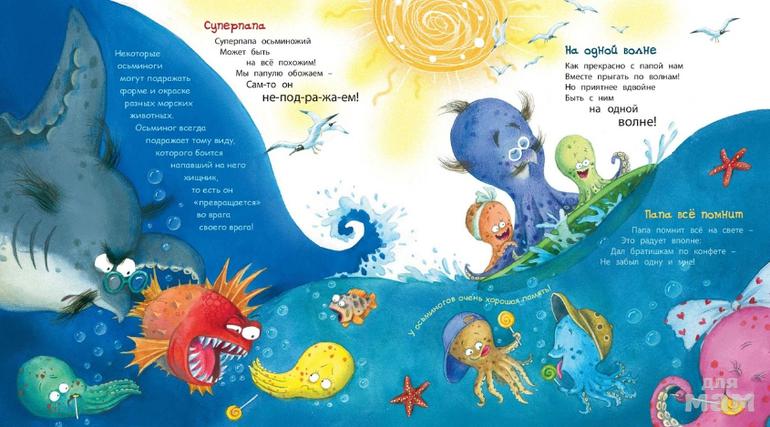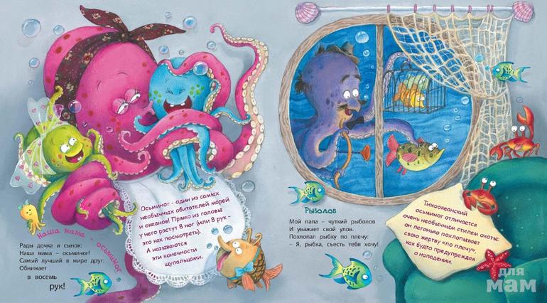 Жизнь удивительна и весела, когда у тебя восемь ног, три сердца и совсем нет костей! Можно целиком залезть в крошечную ракушку или стать плоским, как камбала. Можно сколько угодно обливаться чернилами и по несколько раз за день менять цвет. Да-да, все это и многое другое умеют невероятные и очень умные существа под названием «осьминоги». Заходи скорее к ним в гости – вы подружитесь! Тебе помогут веселые стихи Ксении Валаханович и озорные рисунки Любови Ерёминой-Ношин.