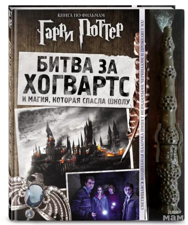 К книге прилагается волшебная палочка с фонариком, который проявляет невидимые чернила, и сам маркер с невидимыми чернилами (его вы найдете внутри волшебной палочки).