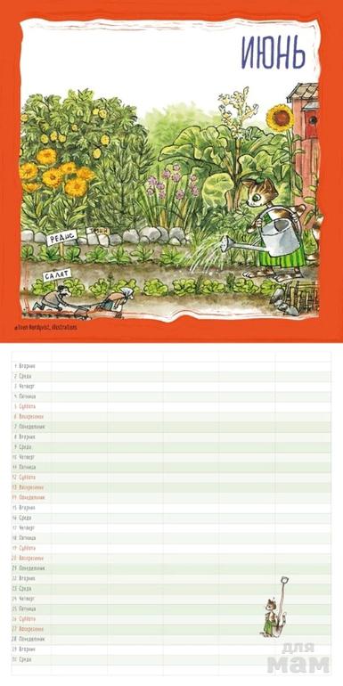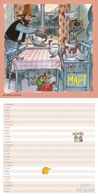 Традиционный семейный календарь на 2021 год с любимыми героями Свена Нурдквиста. Он оформлен в виде планера: слева числа и дни недели, справа - пять столбцов с пустыми ячейками. Каждый столбец можно подписать, а затем добавить дни рождения друзей или составить список дел на каждый день. Каждый месяц начинается с картинки из книг о Петсоне и Финдусе. Календарь вешается на гвоздик