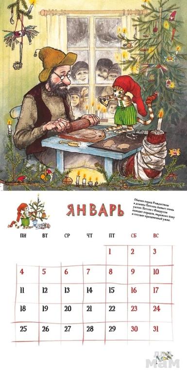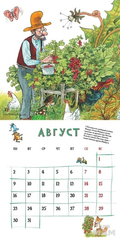 Календарь "Веселый год с Петсоном и Финдусом" на 2021 год с любимыми героями Свена Нурдквиста. Каждый месяц начинается с картинки и цитаты из книг о Петсоне и Финдусе. Календарь вешается на гвоздик.