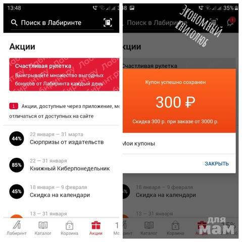 Купон из Приложения можно ввести в Корзине на сайте (если вы оформляете заказ не через телефон, а через компьютер). Для этого в Приложении кликните по кнопке "Мой Лаб" - "Мои купоны" - Купон №... - и введите код (буквы и цифры) в Корзине на сайте вручную.