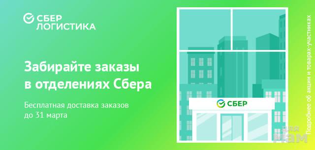 Бесплатная доставка заказов в отделения Сбера. Акция действует с 1 по 31 марта 2021.