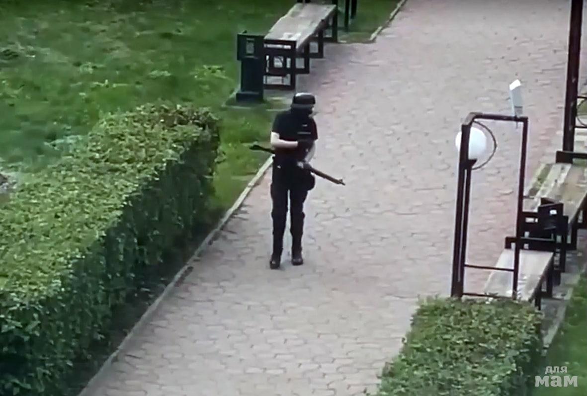 «Напарник организовал эвакуацию. Я забежал в здание на первый этаж, увидел, как вооружённый молодой человек спускается. Крикнул ему «Бросай!», после чего он направил оружие на меня и произвёл выстрел. После чего я применил огнестрельное оружие. Молодой человек упал, подбежав к нему, я зафиксировал движения, убрав ружьё, патроны и нож в сторону. После чего начал оказывать медицинскую помощь».