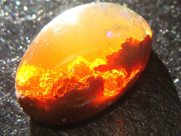 Мексиканский огненный опал, который при разном освещении напоминает или закат в облаках или огромные клубы пламени после взрыва