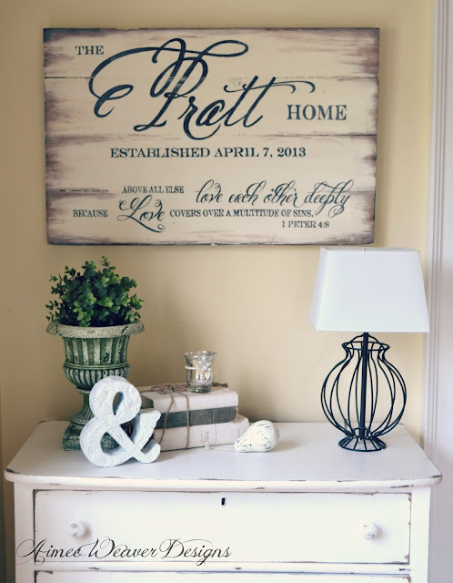 Я использовал карандаш, чтобы написать буквы на абажур, когда я чувствовал, что это нужно немного "что-то". Я использую много старых книг, банки и зелени в моем украшении. Специально для летнего периода. И дерева вывеска над комодом была то, что я недавно создал.