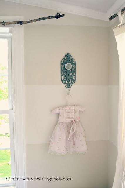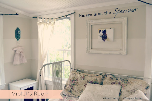 Это маленькая комната Вайолет. Это крошечное пространство, которое использовали, чтобы быть просто местом для хранения, пока мы не превратили его в питомнике несколько лет назад. Это была одна из моих любимых проектов. Такая забава! Я покрасили стены в полоску, использовали ветви с заднего двора, как карнизы, шторы найдены в доброй, и окрашены формулировки и деревьев на стену.