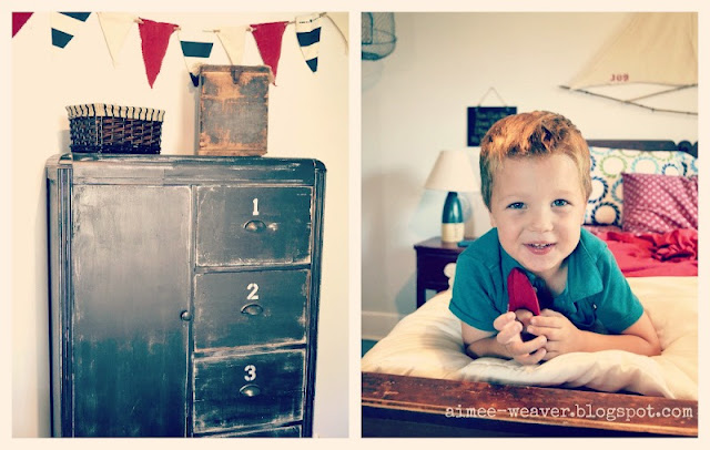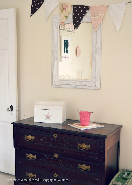Я создал холст с ее силуэтом и виниловые надписи над ним от Hobby Lobby. Железные кровати от продажи двора и античные комод (ниже) от семьи моей матери в законе.
