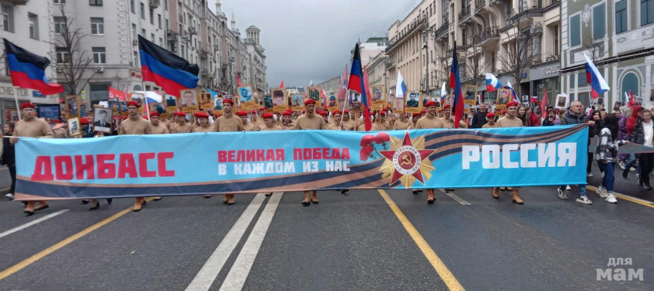 "Мы встретились на Пушкинской с детьми из Донбасса. Очень нарядные, в форме юн.армии, все как на подбор одинаково одетые. Красиво и стройно чеканя шаг, и распевая наизусть победные песни, мы двинулись за ними, замыкая колонну.