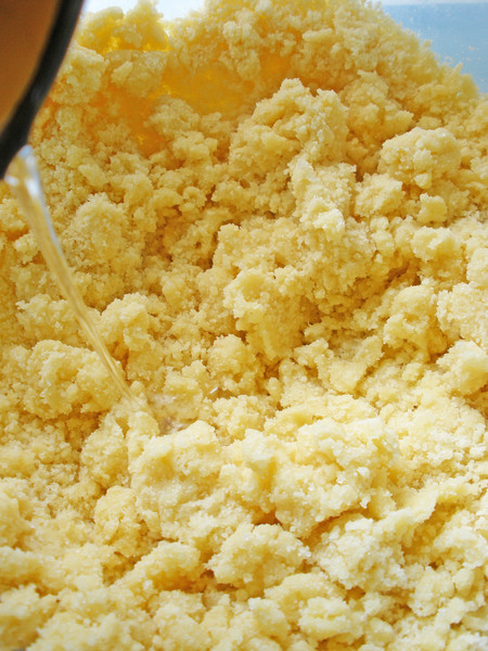 Добавляю яйцо (если оно большое, то лучше только желток) и холодную воду. Я добавила всего 1 ст.л., тесто получилось пластичным.