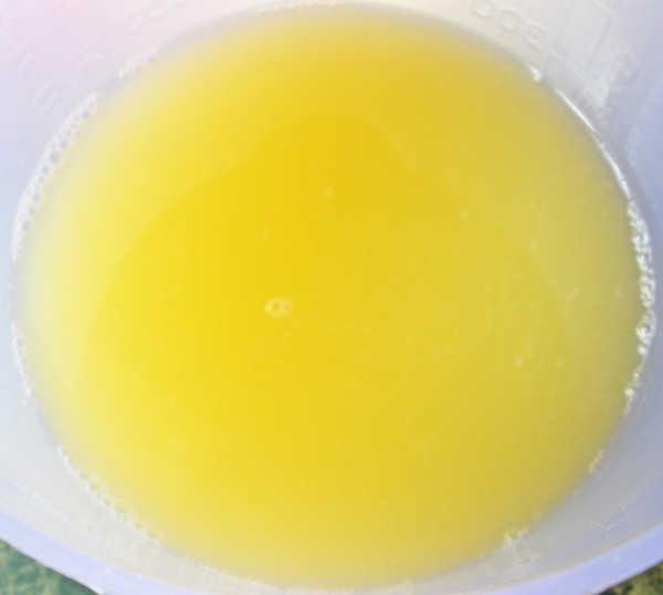 Теперь сок из них выжать легче. Из выжимок получатся вкусные корочки для чая. Получилось 450 мл. сока. В нем растворяю сахар.