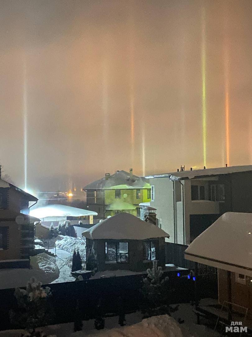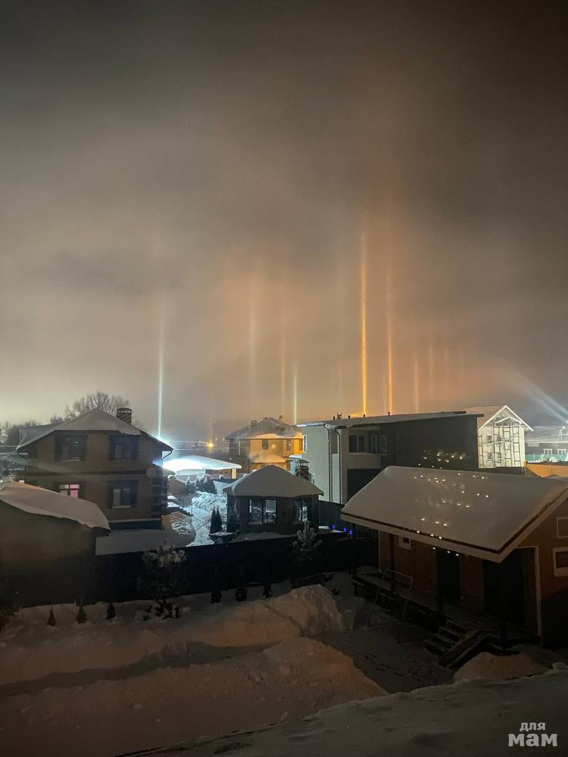 ✨В Дмитровском районе жители наблюдали ночью редкое явление: кристаллы льда в воздухе образовали световые столбы.