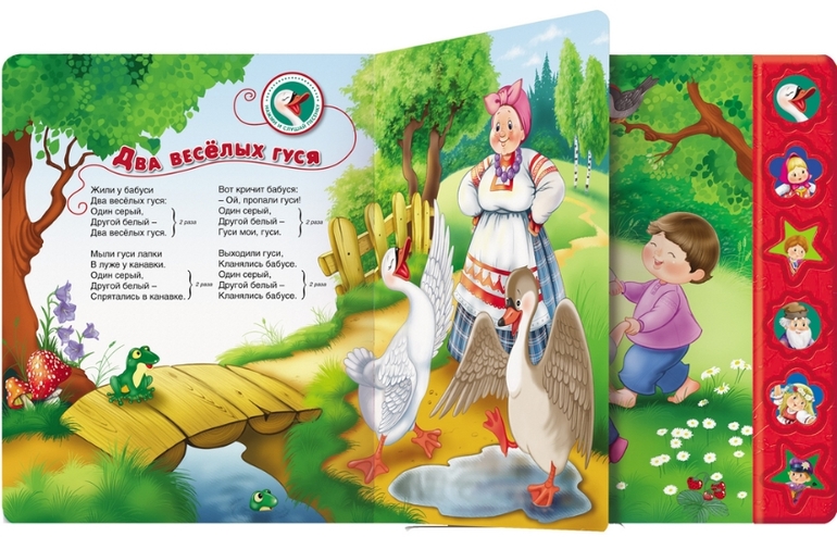 Веселые народные песенки: "Жили у бабуси два веселых гуся", "Каравай", "Во поле берёза стояла", "Барыня", "Калинка" в студийной записи.