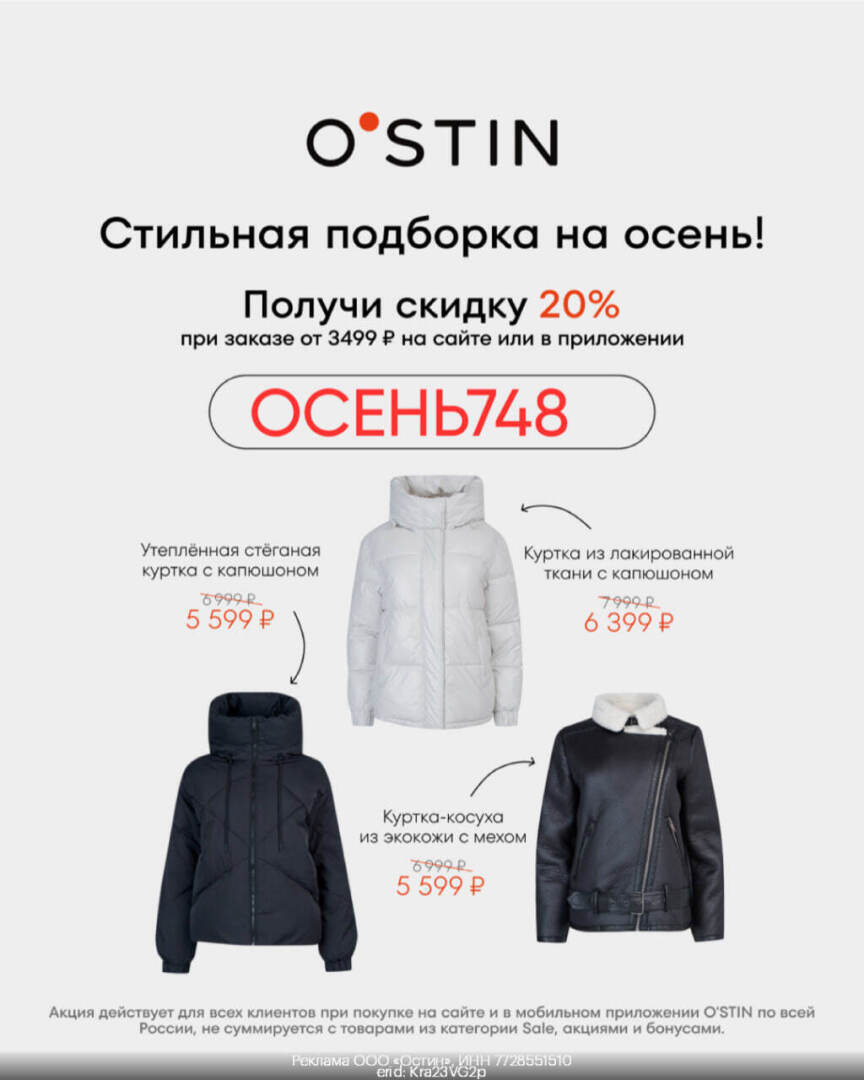 Так что, если вы хотите освежить свой гардероб и подготовиться к сезону с лучшими покупками, не упустите эту акцию от O’STIN. Сделайте заказ на сайте или в приложении, используйте промокод ОСЕНЬ748 и наслаждайтесь стильной одеждой с выгодой!