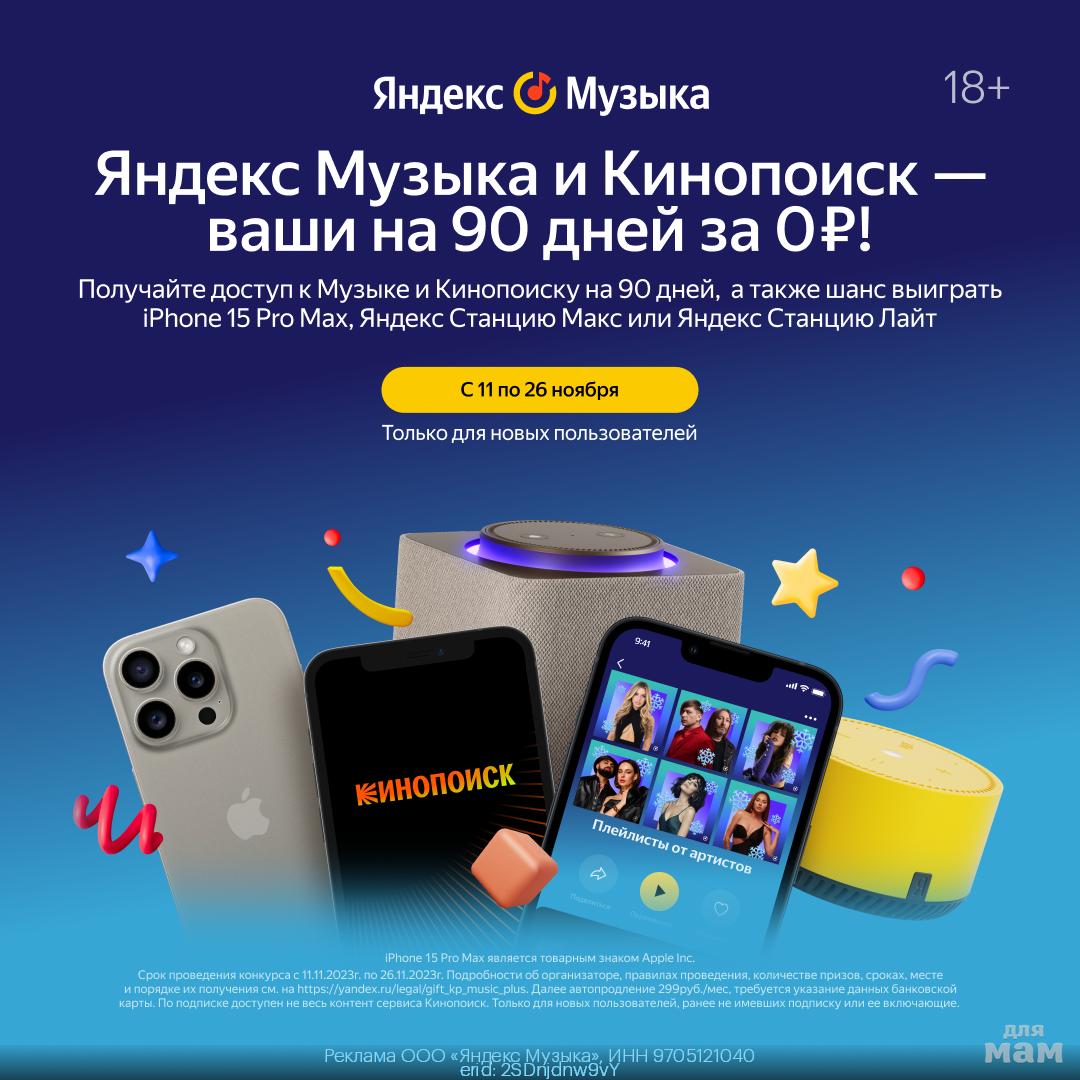Активируйте промокод 4AL6XFGZ и откройте двери в мир звуков и изысканных мелодий на 90 целых дней! Это не только доступ к Яндекс Музыке, но и бесплатный вход на Кинопоиск. Наслаждайтесь вашими любимыми треками, и, кто знает, возможно, именно ваши уши услышат призовой звон!