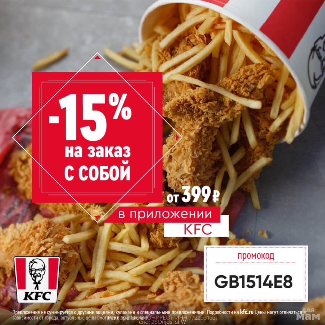 KFC знает, что счастье - это просто, и с этой акцией ваше счастье становится еще доступнее. Загрузите приложение, выберите самовывоз, используйте промокод, и ваш обед или ужин поднимется на новую высоту - с высоты скидки 15%! Поторопитесь, такие предложения - как горячие крылышки - не задерживаются надолго!