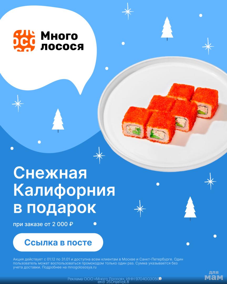 Используйте промокод 04Z0KR при заказе от 2 000₽ и получите ролл «Снежная Калифорния» в подарок! Почувствуйте, как легкий снег из сыра и кокосовых стружек тает во рту, сливаясь с нежным вкусом лосося.