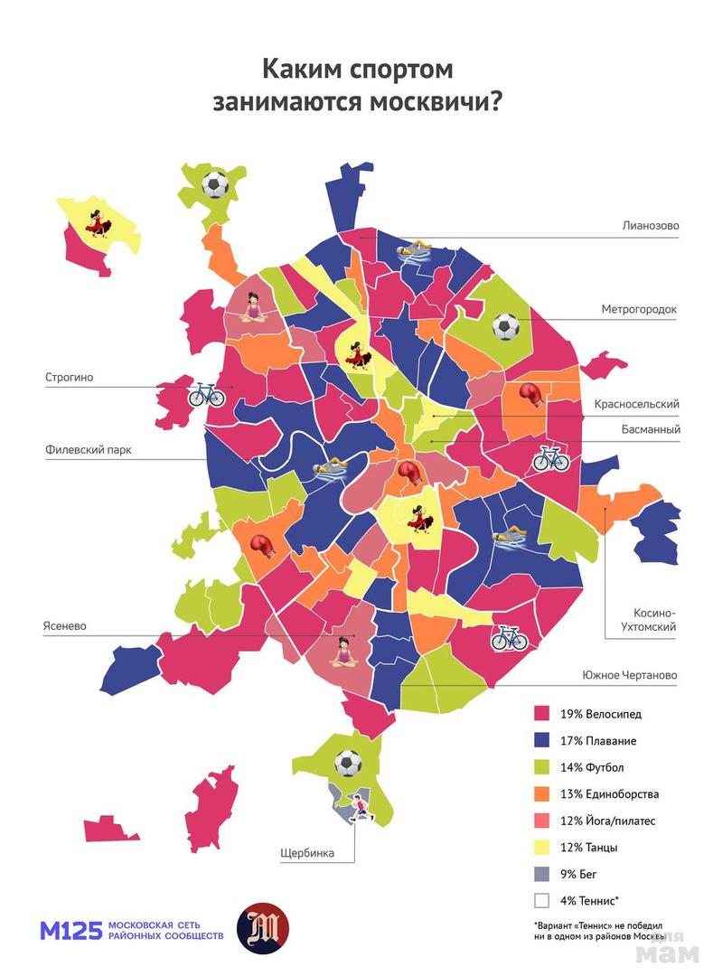 - Самым популярным видом спорта среди москвичей в двух возрастных категориях (17+ и 35+) оказался футбол. Чаще всего в него играют жители ЦАО и САО. На втором месте расположилось плавание. Наиболее популярно оно среди жителей ЗелАО и ЗАО.