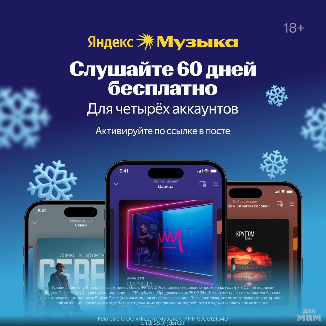 С промокодом UGHAD7V2PL вы получите целых 60 дней бесплатного доступа к Яндекс Музыке. Забудьте о перерывах на рекламу — ваша музыка будет звучать нескончаемым потоком, сопровождая все лучшие моменты зимы.