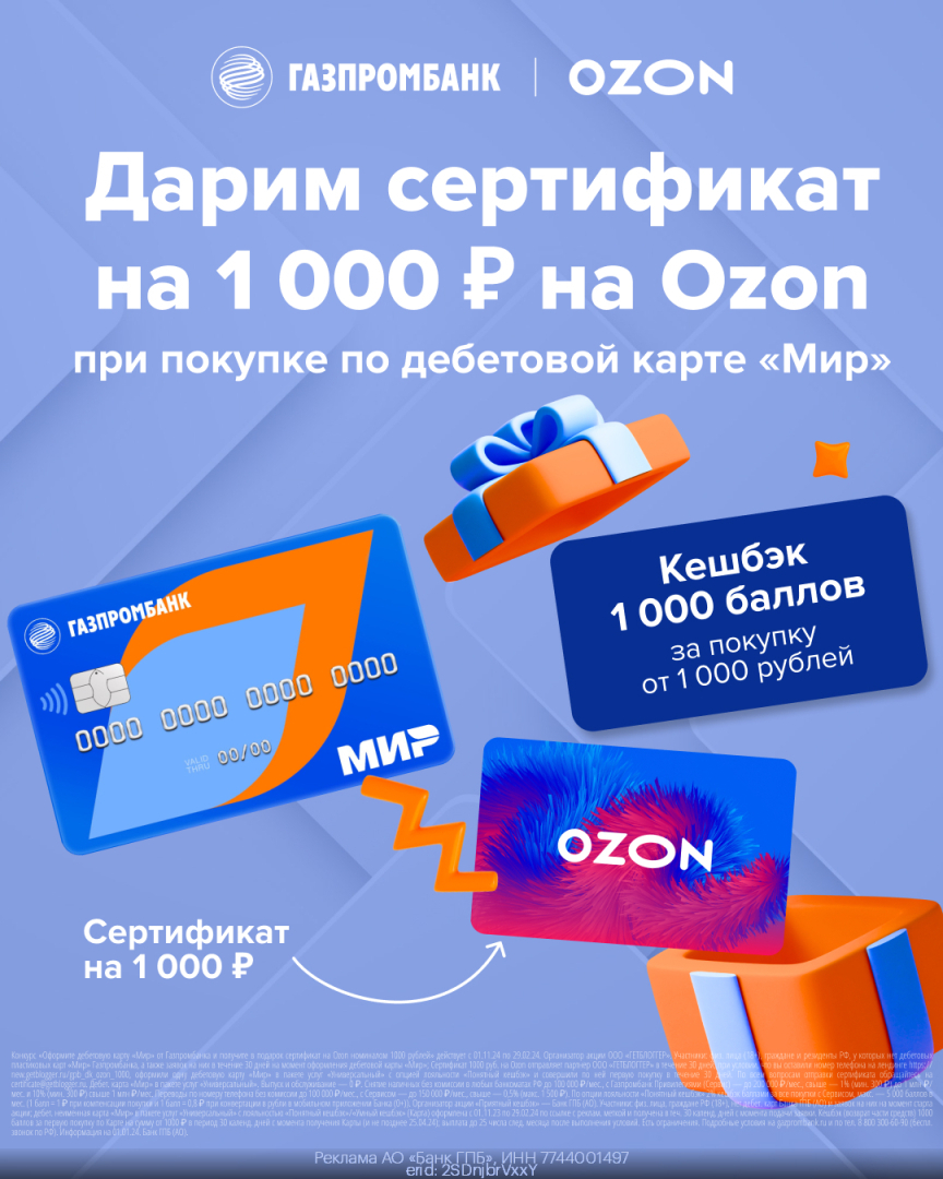 Не упустите свой шанс воспользоваться этим привлекательным предложением от Газпромбанка! Оформите дебетовую карту «Мир», совершайте покупки и наслаждайтесь выгодой в виде кешбэка и подарочного сертификата на Ozon. Подробности акции, условия получения и использования баллов кешбэка, а также список городов, в которых доступна доставка, вы можете уточнить на официальном сайте Газпромбанка или в его отделениях. Реклама. Банк ГПБ (АО). Ген. лиц. ЦБ РФ №354. Реклама. ИНН: 7744001497