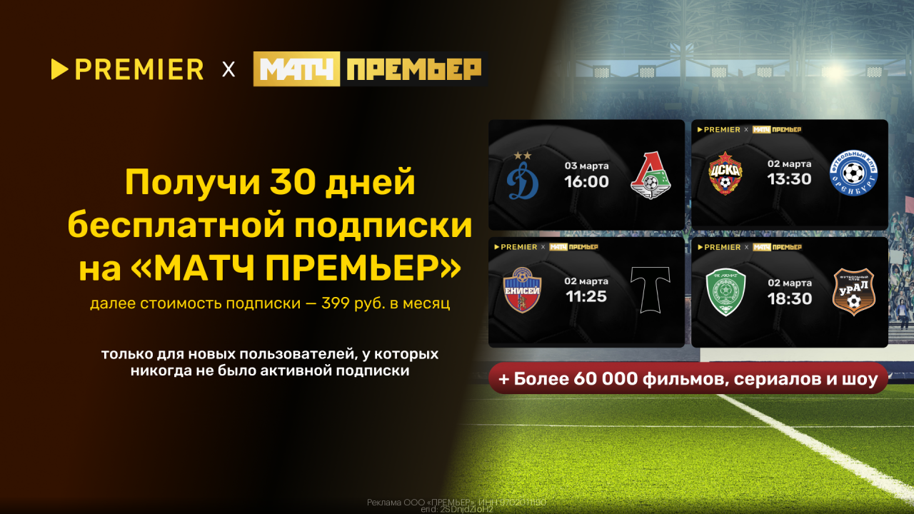 Не забывайте, что такие предложения не бывают часто. Предайтесь эмоциям и адреналину вместе с МАТЧ ПРЕМЬЕР – вашей премиальной подпиской на лучшие футбольные матчи сезона!