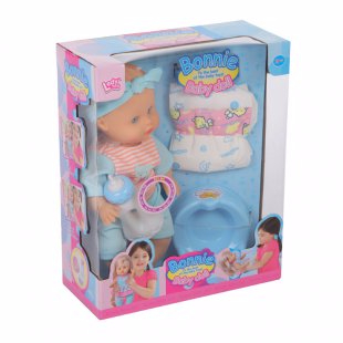 Пьёт, писает, озвучка: папа, мама, смех, нечленораздельные звуки. Голова - ПВХ. Остальное - пластик. Глаза - оргстекло. В комплекте: бутылочка, горшок, памперс