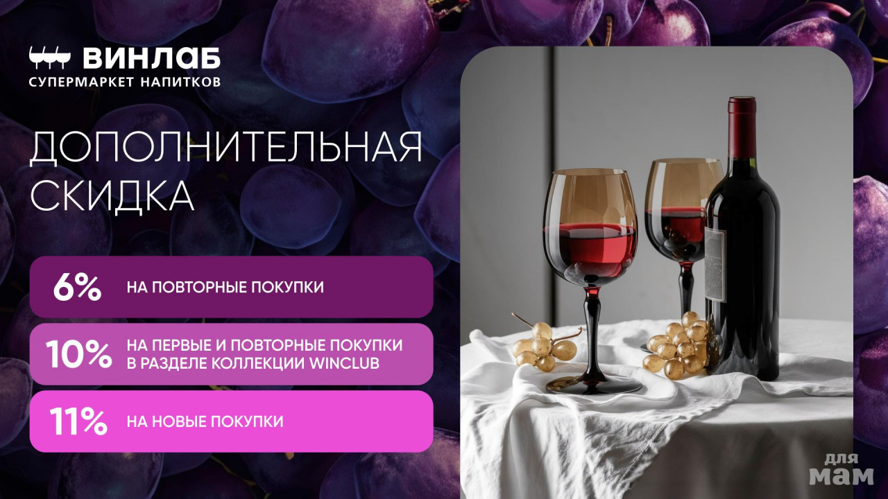 Если вы уже покупали товары в ВинЛаб, воспользуйтесь промокодом 6GB4433, чтобы получить дополнительную скидку 6% на повторные заказы.
