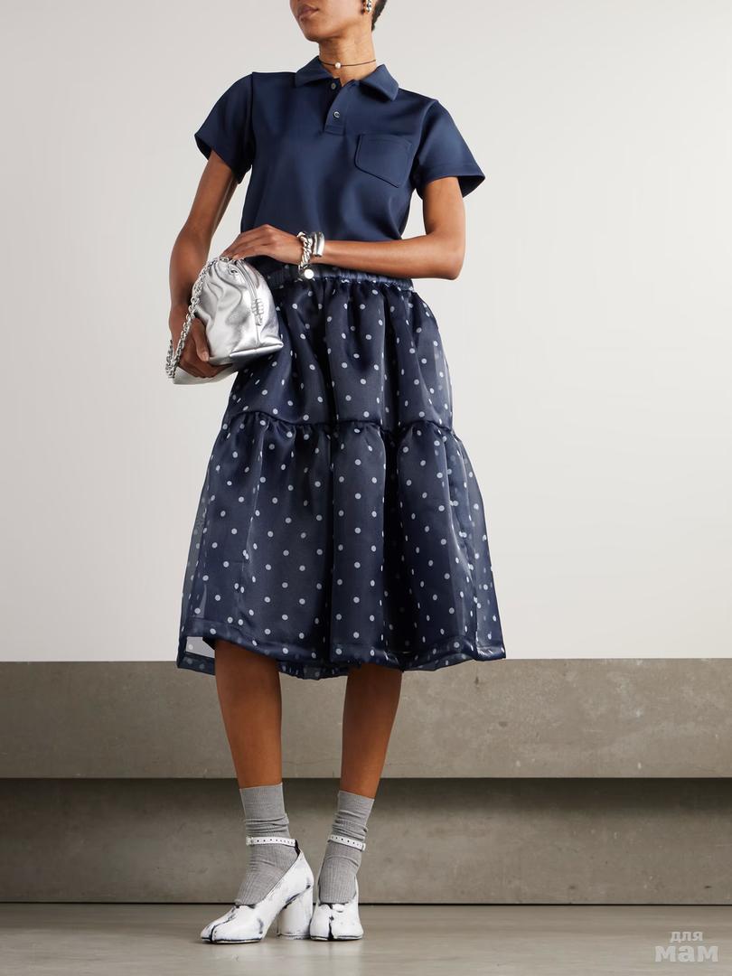 Модную футболку/лонгслив - поло дизайнеры предлагают носить с нарядными юбками. Модель трикотажного поло может быть любой, как цвет (они бывают в полоску, или однотонные, с ровной или рельефной фактурой). А нарядная юбка выбирается в зависимости от ситуации выхода и погоды.