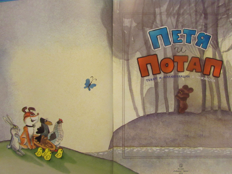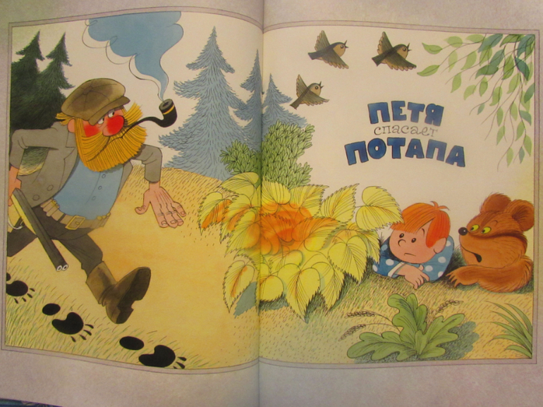 Книжка «Петя спасает Потапа» была выпущена издательством «Гаккен» в 1993 году. Так уж вышло, что японские дети прочитали про Потапа и Петю раньше наших. Чуть позже я собрал все три сказки под одну обложку. Они рассчитаны на дошкольников и младших школьников. Поэтому рисунки поданы крупно, текста мало и он набран крупным шрифтом.