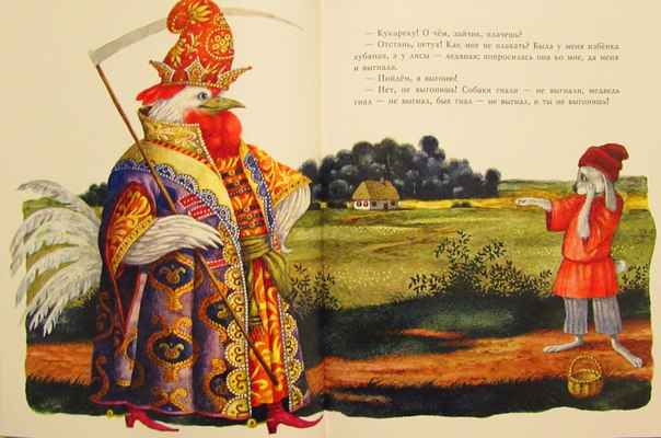 Например, сказка «Колобок». Логично, что на самом первом развороте книги будет нарисован этот колобок. Но нет. Колобок появляется на втором развороте книги. Вместе с медведем. А самый первый рисунок в этой сказке (на первом развороте) это волк. Почему так мне не понятно.