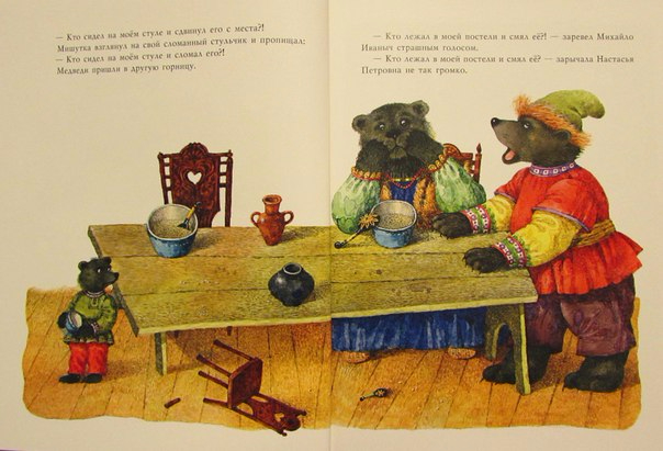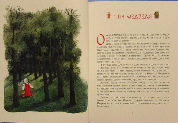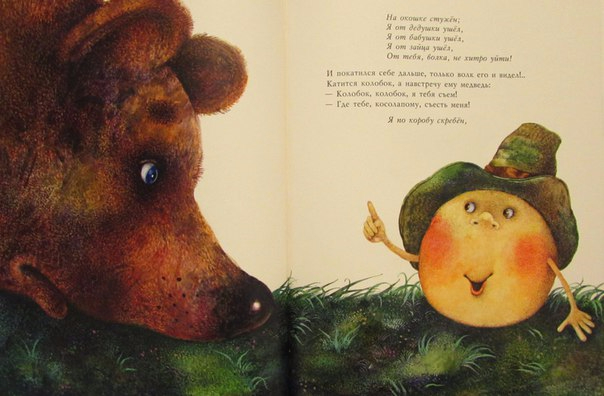 Например, сказка «Колобок». Логично, что на самом первом развороте книги будет нарисован этот колобок. Но нет. Колобок появляется на втором развороте книги. Вместе с медведем. А самый первый рисунок в этой сказке (на первом развороте) это волк. Почему так мне не понятно.