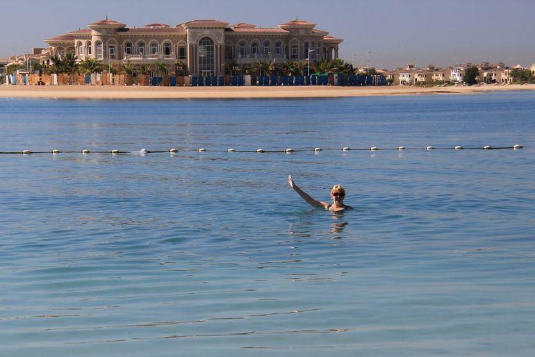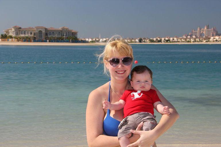 Пляж устроен на внутренне стороне кольца, с видом на виллы, расположенные на лепестках пальмы и отель «Атлантис». Пляж очень широкий и длинный, народу в декабре на пляже было не очень много. Песок очень плотный, как утрамбованный, мы с коляской проезжали свободно. В песке попадаются мелкие ракушки. Вход в море пологий. Вода была +22-23 градуса, у берега чуть теплее. Заходить прохладно, потом плавать вполне комфортно. Хотя купались в основном только русские)) Персидский залив очень соленый! Волн здесь нет, вода очень спокойная. Видны были несколько видов рыбок, один раз попалась мелкая медуза. Море и песок не впечатлили. Для меня теперь идеал моря – это Мальдивы)) Если важен мягкий белый песочек на пляже, то вам не на Пальм Джумейру. Все-таки надо понимать, что этот остров насыпной. Даже на общественном пляже Дубая песка гораздо больше, он мягче. В Абу-Даби – пляжи еще лучше. Но даже здесь дети что-то строили из песка)