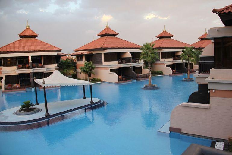 Отель Anantara Dubai The Palm Resort and Spa 5* расположен на искусственном насыпном острове The Palm Jumeirah, в восточной части кольца, окружающего основную пальму. Отель новый, открыт в сентябре 2013 года, поэтому кое-что еще не функционировало полностью. Отель принадлежит сети отелей Anantara. Основная часть номеров находится в коттеджах, которые расположены по «берегам» бассейнов. Плюс есть отдельно стоящие виллы и водные виллы. Позади коттеджей расположены два высоких здания, в которых расположены апартаменты для продажи.