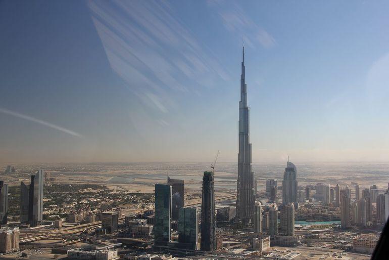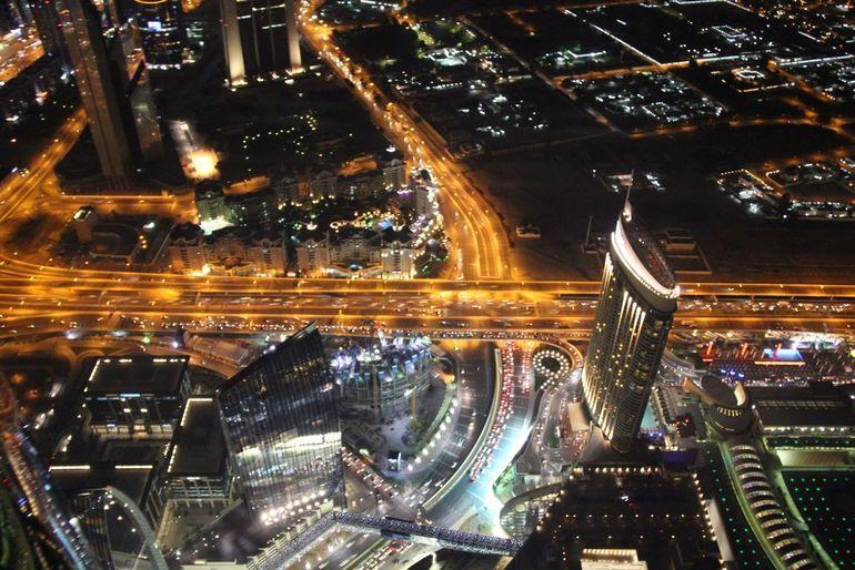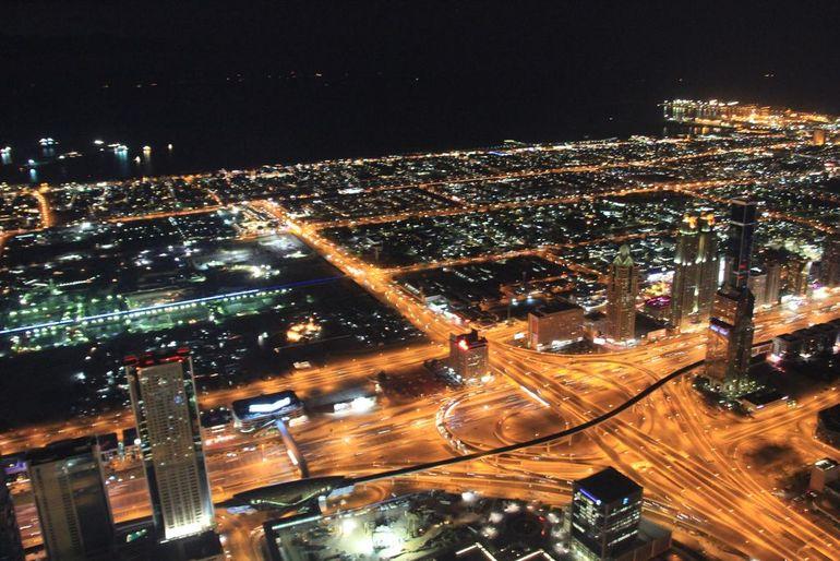 Увидев, что мы с малышом на руках (коляску заставили сдать при входе), нас пропустили одними из первых через первый контроль. Всех проверяют через рамку, все вещи – через сканер. Далее по коридорам к следующему кордону, где тоже пропускали группами по несколько человек. Ну и третий кордон уже перед лифтами. Лифт поднимается на 124 этаж меньше чем за минуту! И вы на высоте 452 метра! Часть смотровой площадки полуоткрыта, часть – глухое стекло. Виды ночного Дубая нереальные! Жаль забыли штатив, поэтому фотки не особо хорошие) Но впечатления незабываемые!