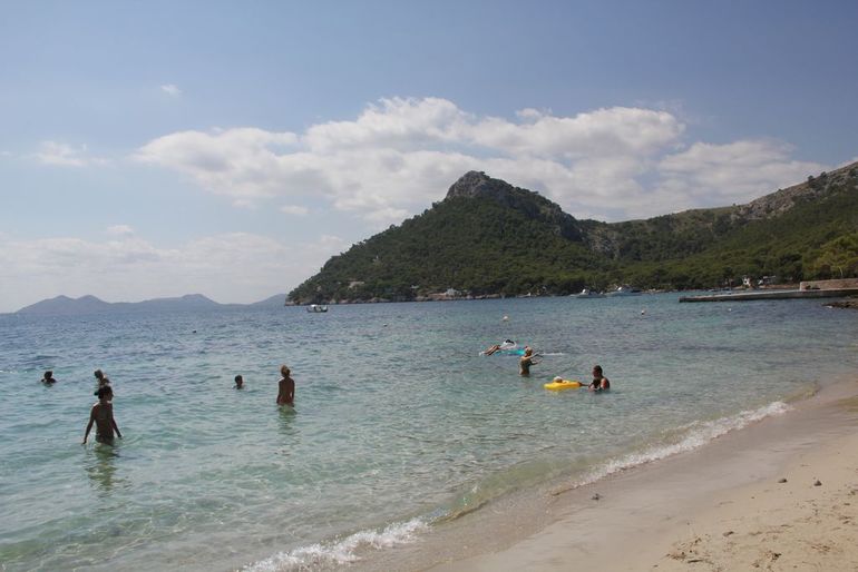 Следующей нашей целью был пляж Форментор. Находится он примерно посередине мыса, и рядом расположен один-единственный дорогущий отель Форментор. Специально для гостей отеля оборудована левая часть пляжа с ценой за лежаки и зонтик - 50 евро/день))) Но есть на пляже и более бюджетные варианты комфортного размещения с ценой от 13,5 до 21 евро за лежаки и зонт) Парковка прямо напротив пляжа - 10 евро/день, чуть подальше в 10 мин. ходьбы - 8 евро. Машин на парковке прилично, и пляж тоже совсем не пустовал. Приехали мы поздновато, поэтому свободного зонта от солнца уже не нашли. Но увидев красоту самого пляжа решено было вспомнить молодость и разместиться на полотенцах под ветвями деревьев, закрывающих от солнца.