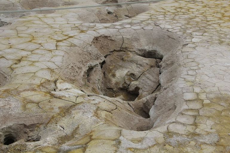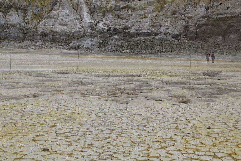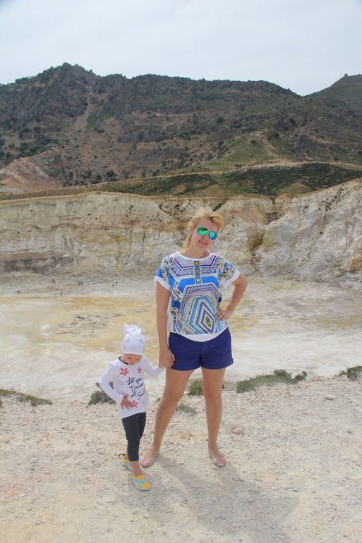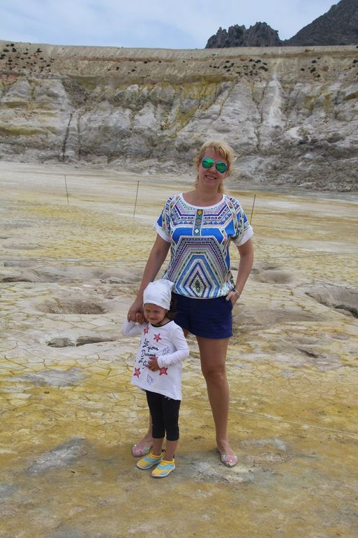 Там нам дали час на прогулку. Владю, спящего в коляске, мы оставили наверху, а сами решили спустится на дно вулкана. Спуск местами крутой, но оно того стоило! Побыли в кратере действующего вулкана! В некоторых местах из-под земли идет дымок, часть территории огорожено, туда заходить нельзя, можно обжечься или провалится.