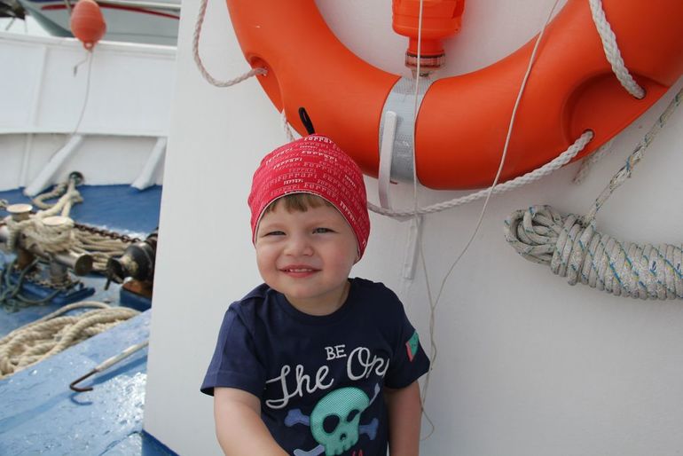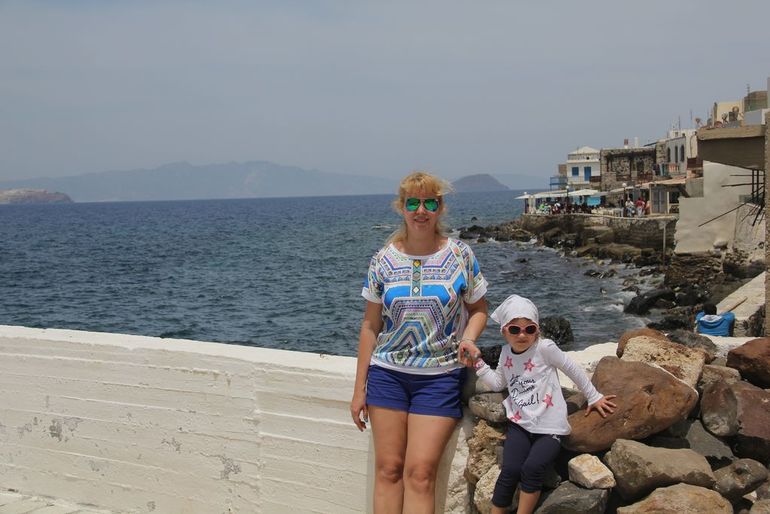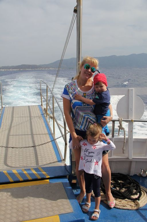 Забрали нас в отеле, довезли 5 мин. до Кардамены, там прошлись 5 мин. пешком до причала на наш кораблик. Можно было сесть внизу или наверху, из-за детей мы выбрали низ, т.к. там меньше дует, а наверх сходили просто посмотреть.