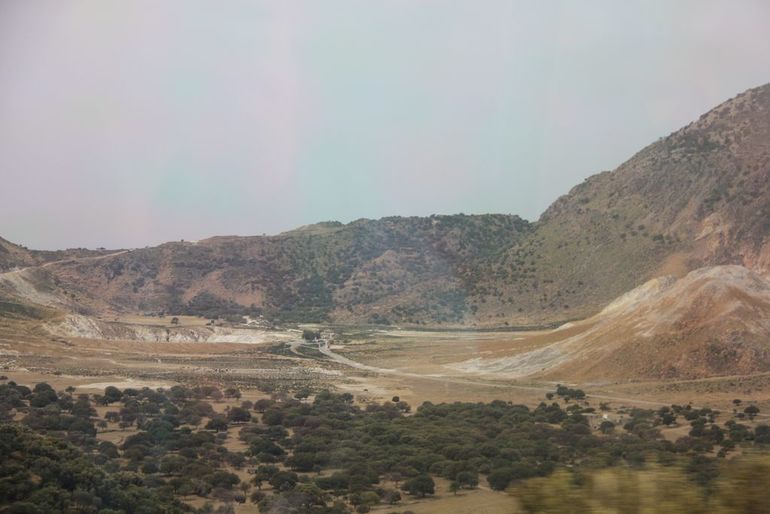 До Нисироса плыли примерно час. Там нас пересадили в автобусы и мы поехали к вулкану. Ехать около 20 мин., дорога крутая, на подъезде офигительные пейзажи.