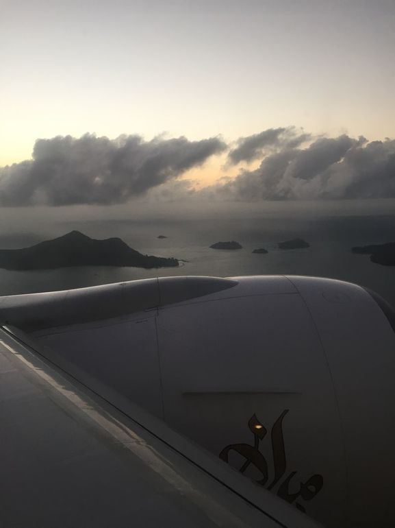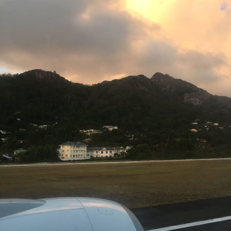 Приземлялись в Маэ на рассвете, наблюдая за островками на глади воды.