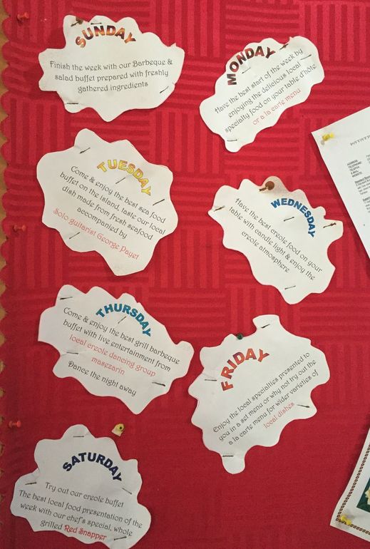 По вечерам в отеле почти каждый день разное меню, вот расписание по дням с информационного стенда: