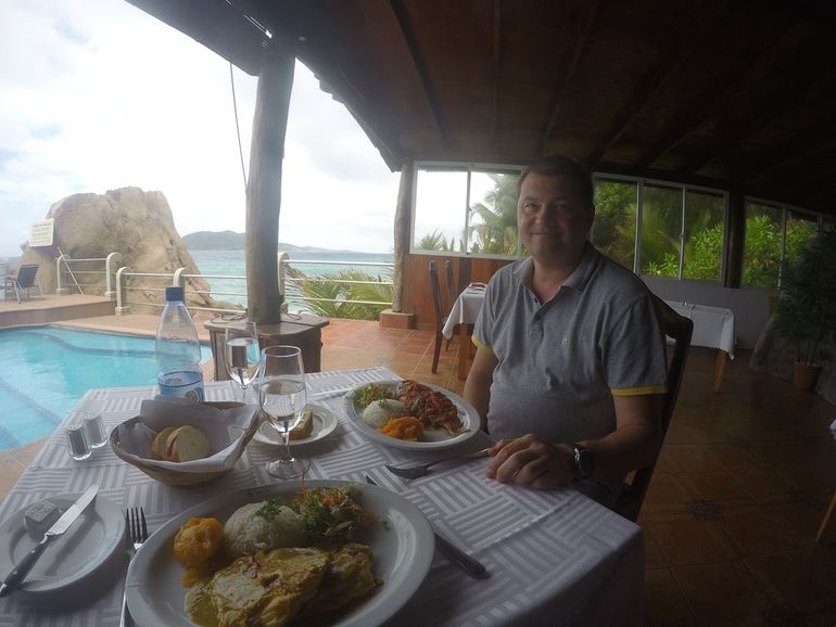 Но у нас ни разу не получилось поужинать в отеле. Либо ужинали вне отеля, либо вообще обходились без него, если задерживались с обедом. Один раз обедали в отеле, все очень вкусно, порции огромные, цены среднесейшельские (1 блюдо - 200-220 рупий + 20% налоги и сервис, итого примерно 1200-1400 руб. за блюдо, вода 45 рупий). Рыба свежайшая и вкуснейшая!