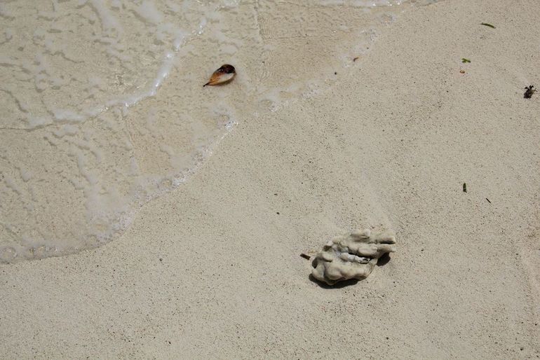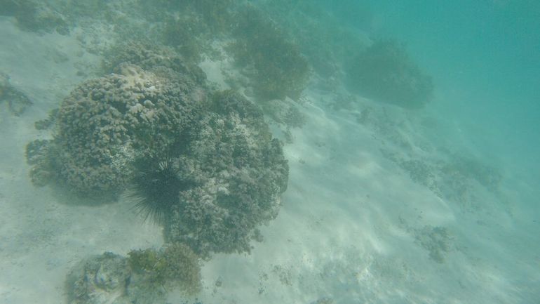 Мы сходили искупались. Волны здесь небольшие, по сравнению с нашим отельным пляжем, и вода очень хорошо прогрета из-за того, что довольно мелко (примерно по пояс), по ощущениям около 30 градусов, коралловый риф уходит далеко вглубь от берега. Ночью был ливень, поэтому вода чуть мутновата, в воде периодически попадаются кусочки кораллов, но я купалась без тапок, дискомфорта особого не было. Также на этом пляже в воде довольно много травы, а дальше начинаются кораллы, чем привлекают сюда любителей снорклинга. Но видимость была плохая, муж сплавал с маской, чуть поснимал на камеру: