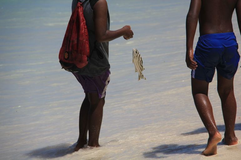 Мальчишки поймали рыбу)