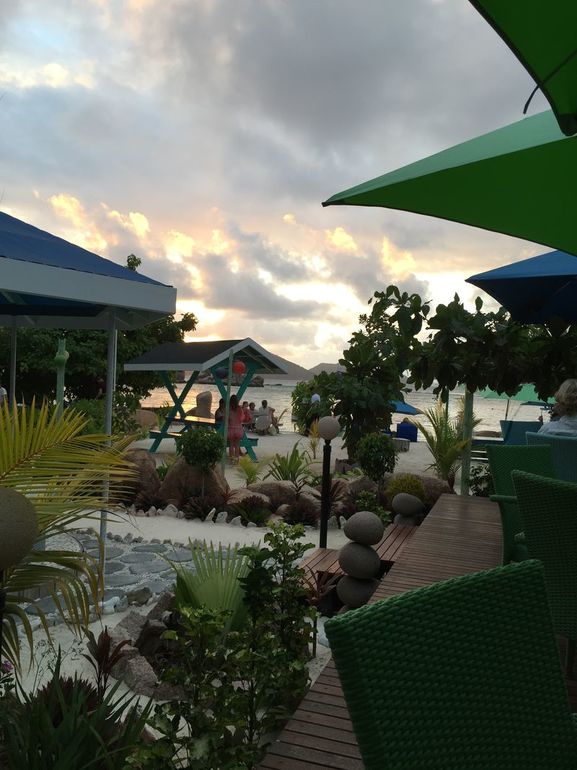 Отмечу, что интернет на Сейшелах дорогой. Связь предоставляют 2 провайдера, на на Ла Диге - вообще только 1. Подключится можно, купив в отеле или офисе специальную карту доступа. Тарифы драконовские: 1 час доступа - 100 рупий (500 руб.), 24 часа доступа, которые надо потратить в течение 2х дней - 500 рупий (2500 руб.) ну и т.д. Поэтому поужинав в этом кафе в первый вечер, мы получили пароль к вайфаю и возможность выйти в инет каждый раз, проходя мимо этого кафе))) Но кафе и еда в нем нам понравились! Очень романтическая обстановка на террасе, с видами на закат. Мы потом заходили сюда в другой день обедать) Цены в меню без учета налога и сервиса (еще 20%). Примерный уровень цен: 2 блюда + пиво - 3,5-4,5 тыс.