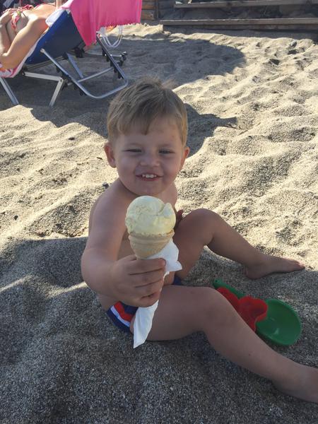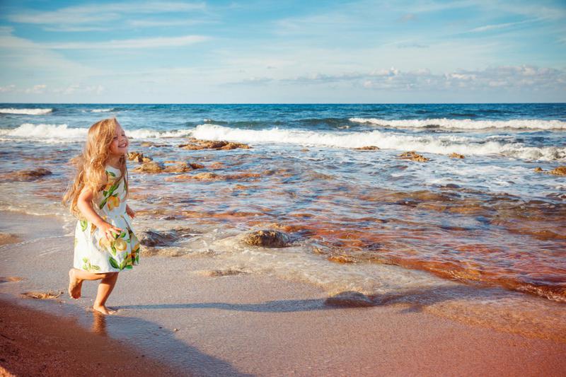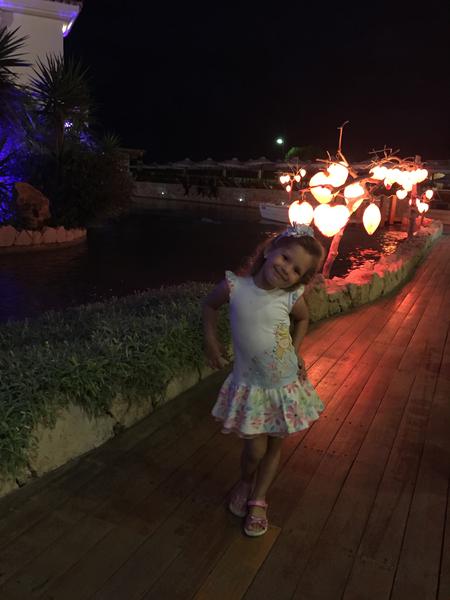 На пляже - крупный песок, с вкраплениями гальки, хороший, дети с удовольствием копали. Но при заходе в воду примерно через пол метра-метр начинаются камни на дне. Мне это особо не мешала, т.к. я могла сразу от берега поплыть, Алине видимо тоже)) Хотя вода прозрачнейшая. Иногда прибивало сухую траву к берегу, но ее убирают. Когда мы приехали, температура воды была 24 градуса! Мою Алю было не вытащить из воды)) Перед отъездом чуть прохладнее, наверно 23. Периодически ветер и небольшая волна, вот тогда в море Алину не пускала, купались в бассейне.