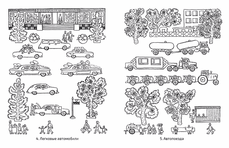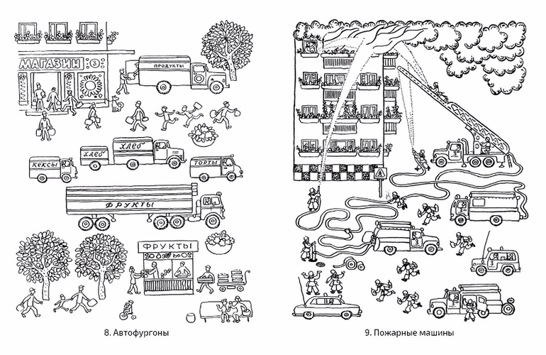 Каждая страница - это зарисовка из жизни, её можно рассмотреть, описать своими словами и раскрасить.