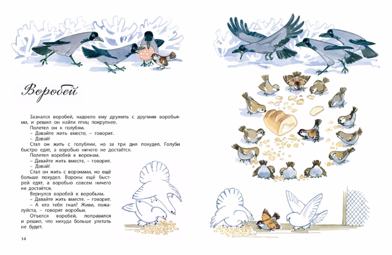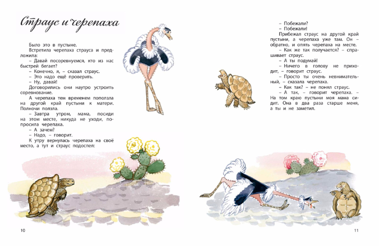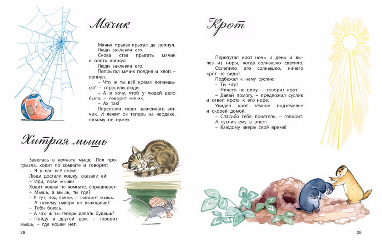 Герои коротких сказок Сергея Баруздина - собака и кошка, страус и черепаха, жираф и тушканчик, воробей, улитка, рыбы и прочая живность, а также мячик, верёвки, сапоги, лапти и даже книжки.