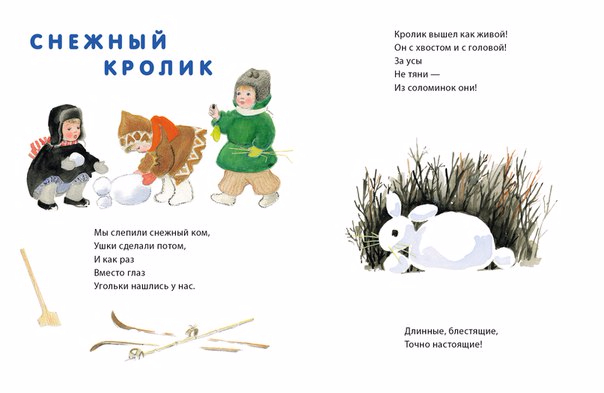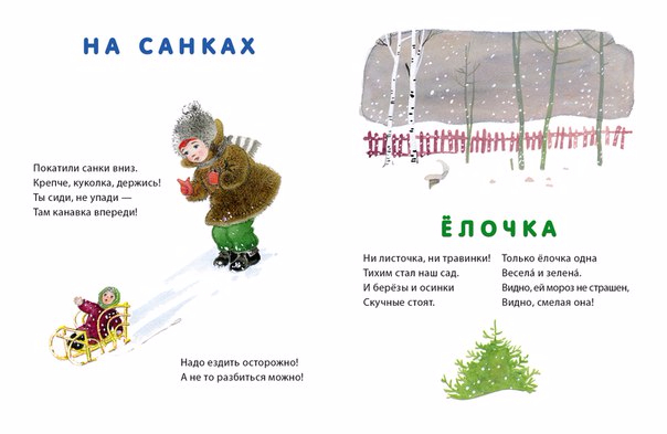 Наступила зима, с неба падают холодные звёздочки-снежинки. Мурка мёрзнет на улице и просится домой, а зелёная ёлочка не боится мороза. Девочка катает куклу на санках. Малыши лепят снежного кролика. Стихи Ольги Высотской для самых маленьких проиллюстрировала Наталья Мунц.