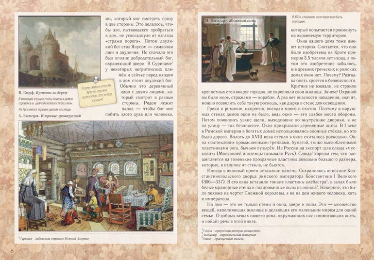 У каждого народа свои представления об удобстве и красоте родного дома. Например, японцы обходятся… без стен. Захотел уединиться - раздвинул бумажную ширму и можешь спать, читать, размышлять о жизни. На Руси когда-то жили в землянках - климат в нашей полосе холодный, так что не согреешься в доме с бумажными стенами. Кто-то строил дома из глины, кто-то из дерева. И все всегда старались сделать его теплым, крепким, красивым. Из книги можно узнать историю вещей, к которым люди привыкли и давно перестали ценить их удивительные свойства. Попробуем разгадать загадки обычных вещей.