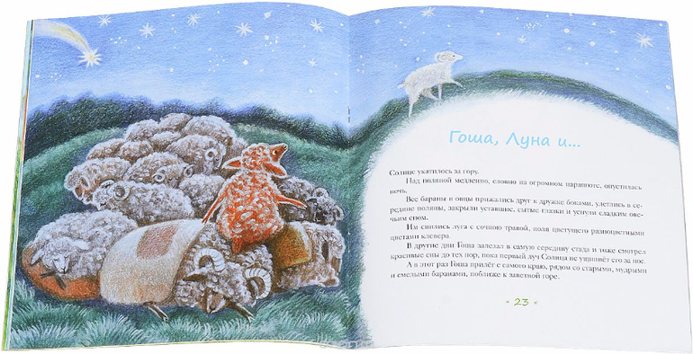 Барашек Гоша - существо очень необычное. Он влюбился не в кого-нибудь, а в само Солнышко и мечтал когда-нибудь встретиться с ним. Целыми днями напролёт Гоша глядел в небо, забывая о вкусной травке и отдыхе. И всё бы ничего, но только другие барашки не понимали Гошиной мечты и смеялись над его фантазиями. Ведь пределом их мечтаний было набить свои животики и сладко поспать. Но однажды именно Гошина любовь к небесным светилам спасла стадо от страшной беды и заставила других баранов задуматься о небе...